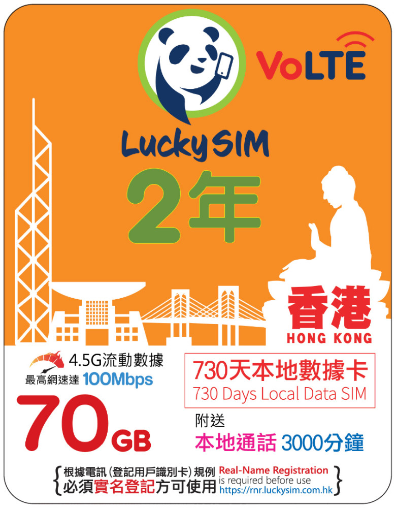 提供 70GB 香港數據、3,000分鐘香港通話,有效期 730 天